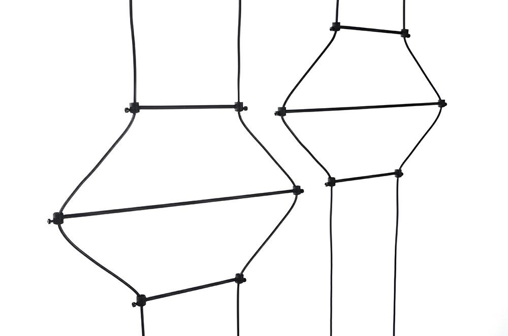 Forma lampii este data de elemente metalice, care impreuna cu firele formeaza o structura geometrica in negru.