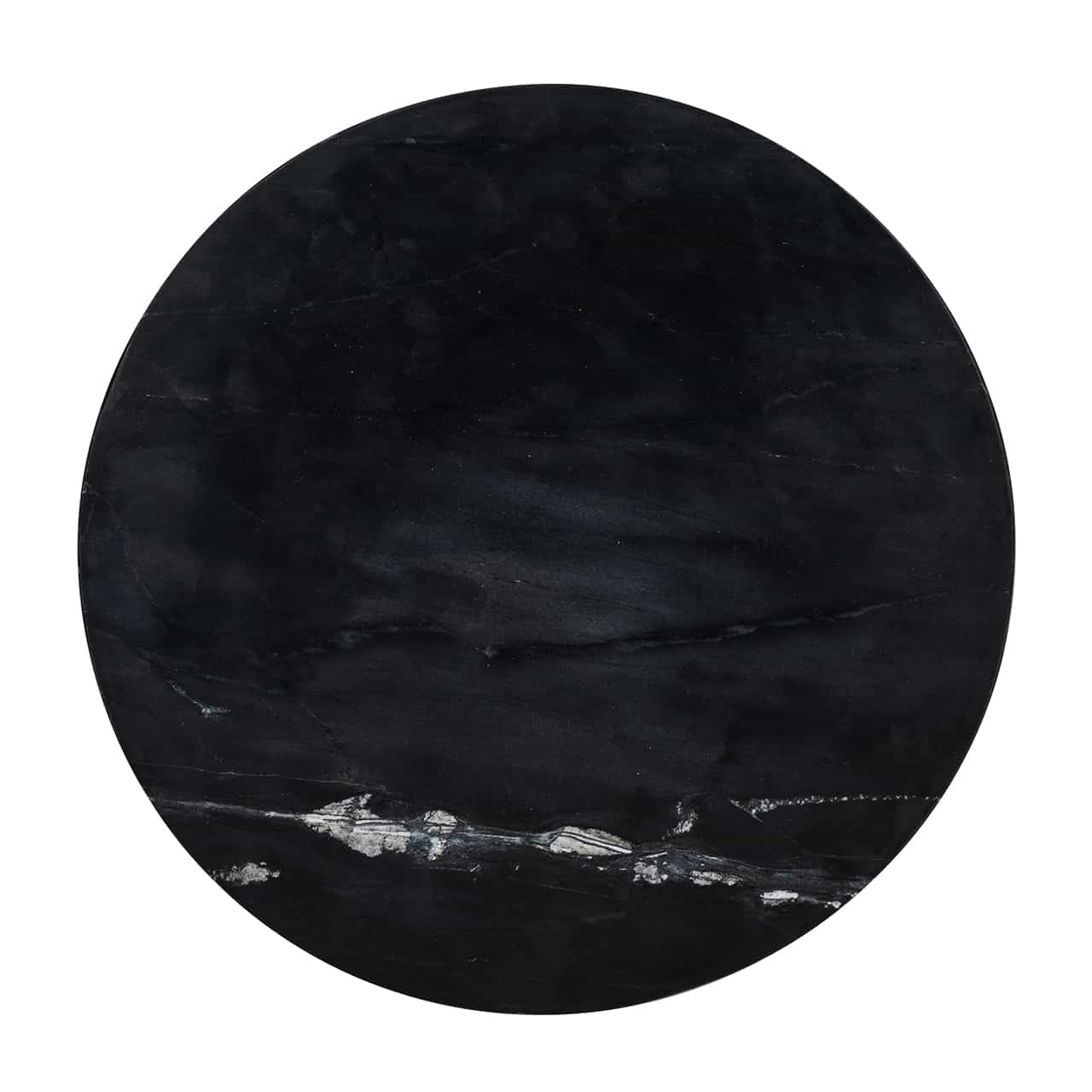 Blatul mesei rotund din marmură neagră groasă se potrivește perfect cu corpul din alamă.