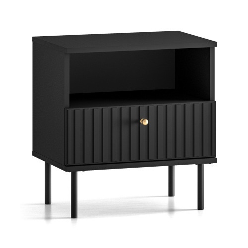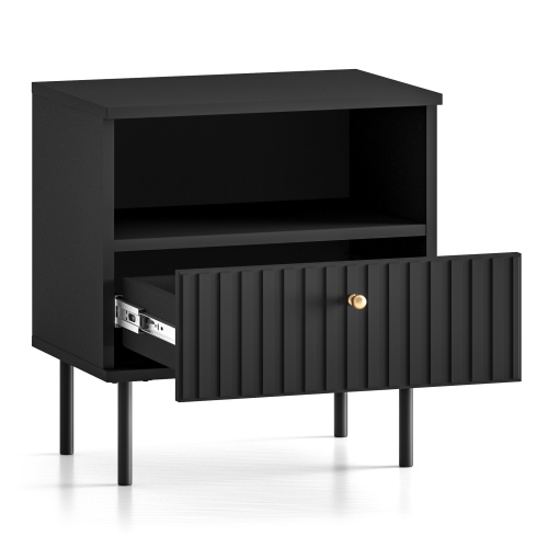 Noptiera Sophie nu numai că arată uimitor, dar oferă și o funcționalitate excelentă. Partea frontală este împodobită cu șipci subtil frezate, care, combinate cu mânerul auriu, adaugă caracter și rafinament. Dispune de un sertar spațios și un raft sub blat, oferind spațiu pentru un telefon, încărcător și diverse accesorii utile.