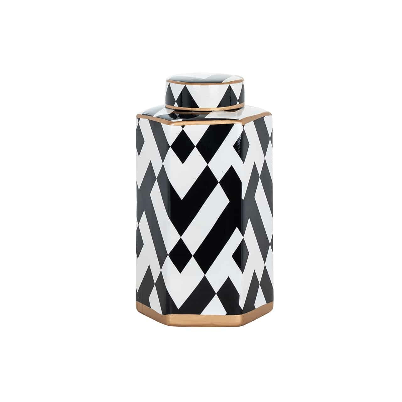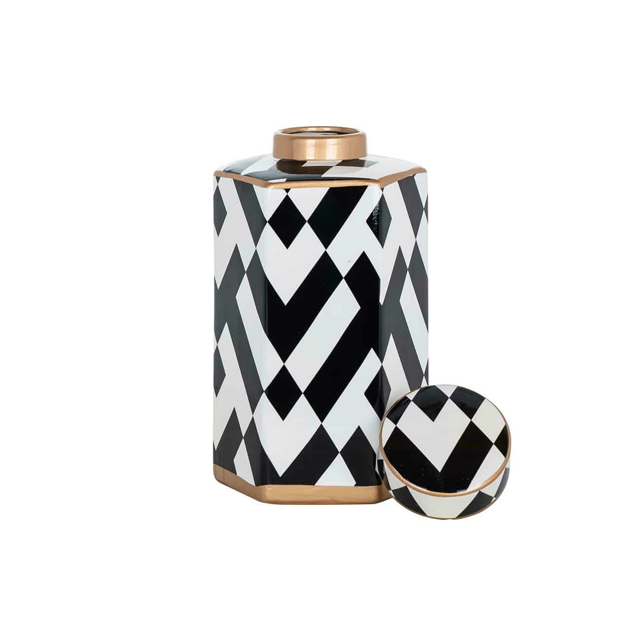 Design amforă ceramică alb-negru cu garnitură de cupru.