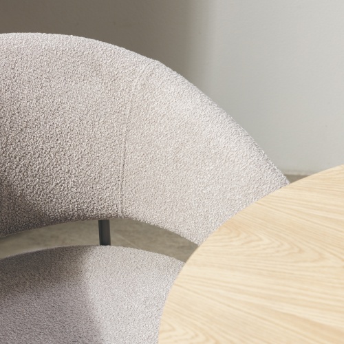 Scaunul Lamu combină confortul cu eleganța modernă. Șezutul moale, spătarul rotunjit și picioarele metalice îi oferă un aspect consistent, potrivindu-se perfect cu diverse stiluri de interior. Tapițeria din țesătură boucle adaugă un caracter unic acestui model de scaun, este plăcută la atingere și aduce și o notă de confort în casă.
