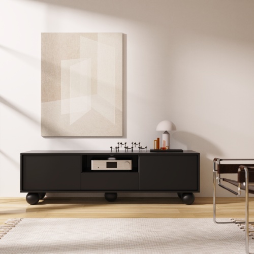 Elegantul suport TV Quadri, într-o nuanță modernă de maro espresso, oferă un design modern și trei sertare practice. Detaliile din stejar, precum picioarele și mânerele solide, îi subliniază calitatea și funcționalitatea.